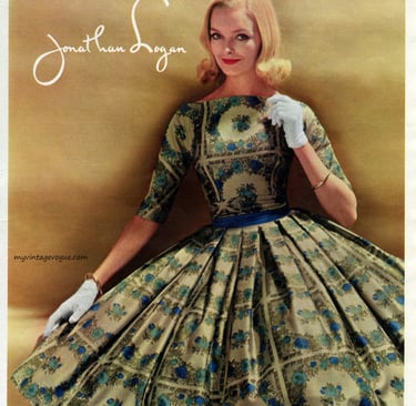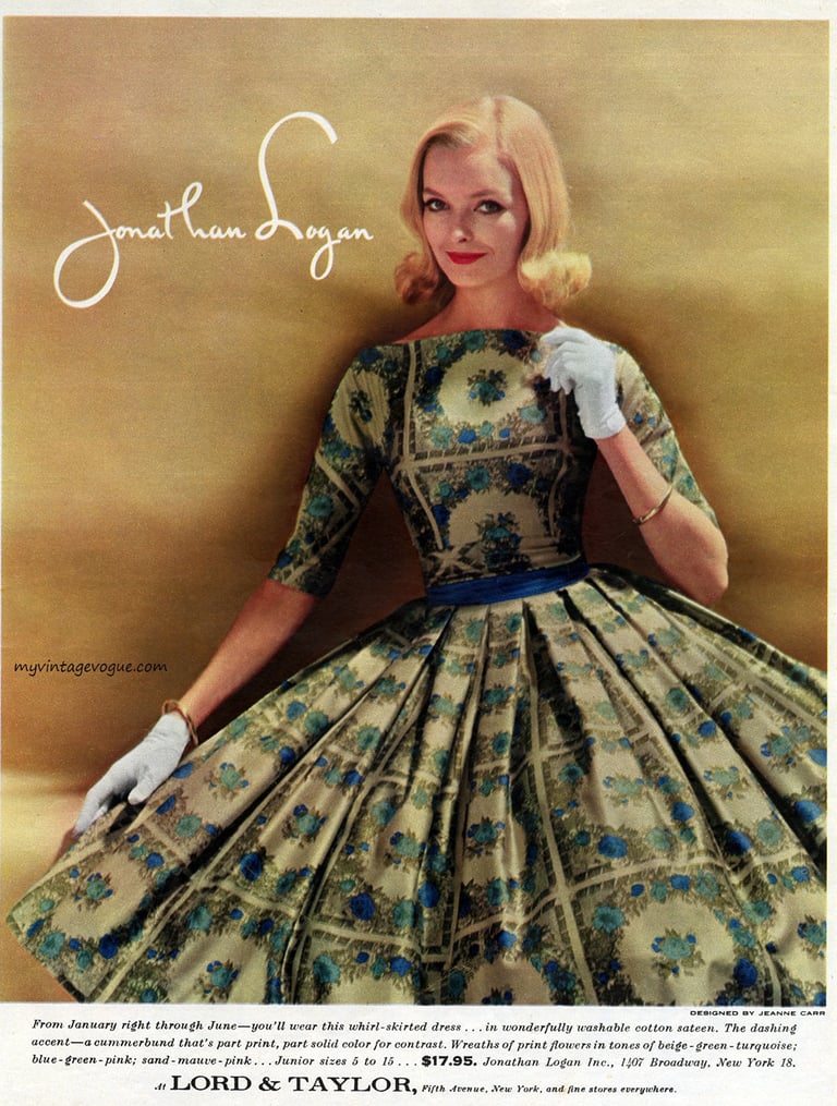 Characteristics of the early styles of Jonathan Logan designed by Doris Varnum was the demure fitted bodice, often with a large collar and ¾ sleeves. A full skirt, usually with a matching belt, the skirt ballet length, just below the knees and flared petticoats. Gloves, handbags and medium heeled shoes were essential accessories. Patterned fabrics were popular as well as stripes.