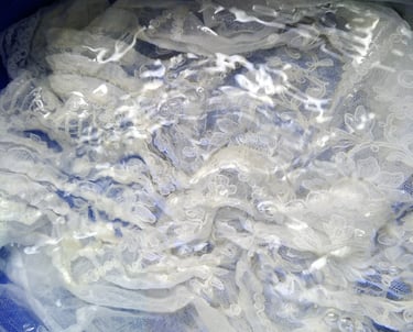 Store flat and preferably in an acid-free box or wrapped in lignin-free and acid-free tissue paper. Pad out the folds with bunches of the same tissue. Use buffered acid-free tissue paper for most fabrics and unbuffered acid-free tissue paper for silk and wool items.