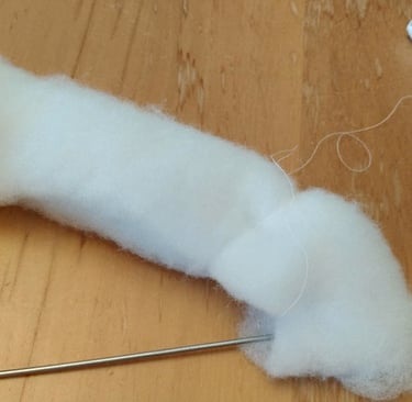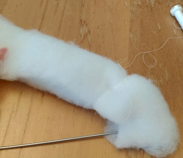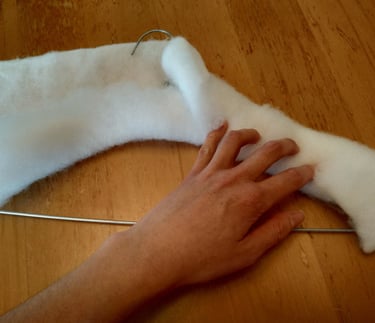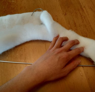 Tie on some cotton thread to one side of the hanger and wrap loosely around the wadding and tie off at the other side to hold the wadding in place. At this stage you can compare the hanger to the garment you want to hang up and check if the shoulders are wide enough. If the garment is especially fragile or heavy, add more layers of dacron and possibly add some around the neck and base of the hanger.