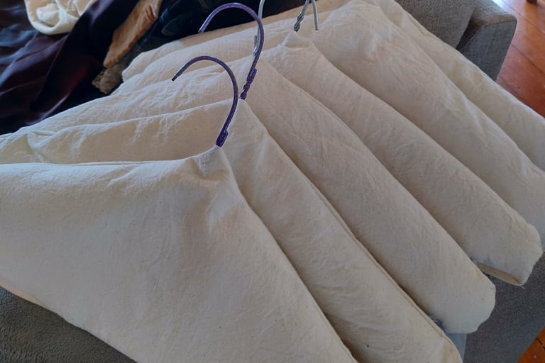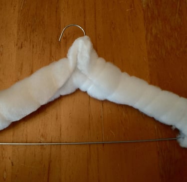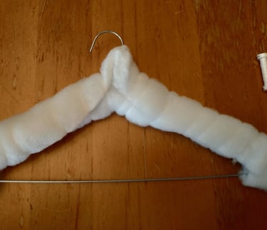 Here's a method for easily covering and padding out your clothes hangers to best support whatever special item you’re storing on it. By combining a metal clothes hanger with polyester wadding and plain cotton you can make a custom support for your garment from materials that are easy to clean, to replace and that won’t cause any damage.