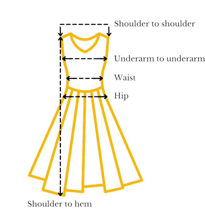 Shoulder to hem: Vertical measurement from the highest point of the shoulder seam to the lowest point of the skirt hem.